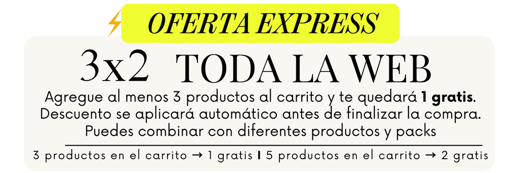 Promoción: Llévate 3 productos de diferente tipo y 1 es totalmente GRATIS. Debes agregar los 3 productos al carrito y 1 producto (de menor valor) quedará automaticamente GRATIS y se descontará del valor total de tu compra.